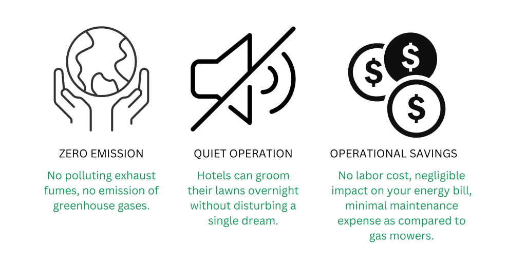 Unlike conventional mowers, this robotic counterpart operates with whisper-quiet efficiency, eliminating disruptive noise pollution commonly associated with landscaping activities. Its precise cutting mechanism, powered by razor-sharp blades, delivers immaculate results, leaving behind a flawlessly manicured lawn that enhances the aesthetic appeal of your establishment.